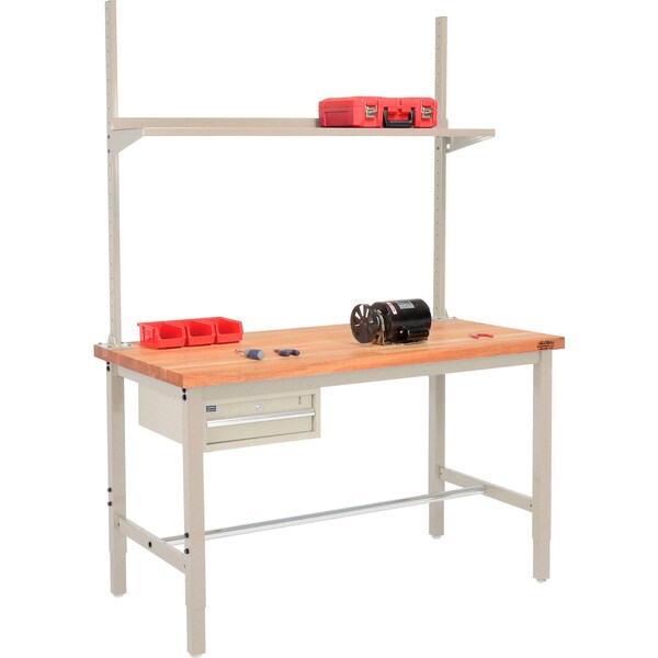 Square-edge maple Boos butcher block by John Boos & Co. High weight capacity to handle most projects and tasks Versatile configuration with drawer, upright, & shelf. These production benches offer the same high quality construction as our heavy duty benches but with the added convenience of locking stackable drawers. High quality industrial work bench is built to last using rugged 2in x 2in x 14 gauge tubular steel height adjustable legs. Legs adjust at 2in increments. These workbenches are tested to 5,000 lb. capacity. 6inH drawer can be mounted to either left or right hand side under the counter top for lockable storage. Secures valuable tools, supplies and more using a cylinder lock with 2 keys. Drawer runs smooth on nylon rollers. Base includes a set of adjustable leveling floor glides and a set of leveling foot plates that allow floor anchoring. Powder coat finish. Quick and easy assembly. Bench Includes: Lockable Drawer. Upright Kit with Shelf.