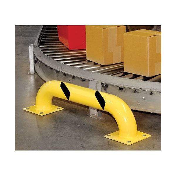 9Hx36L round low profile indoor/outdoor rack guards. Protect warehouse, parking and loading areas, providing protection for pallet racks, machinery and personnel. All welded steel construction measures 4-1/2 diameter. Base plates measure 8 x 8 square. Safety yellow powder coat finish with black visibility stripes. Hardware is not included.