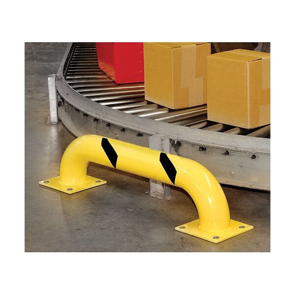 9Hx48L round low profile indoor/outdoor rack guards protect warehouse, parking and loading areas. These 9H Low Profile guards provided protection for pallet racks, machinery and personnel. All welded steel construction measures 4-1/2 diameter. Base plates measure 8 x 8 square. Safety yellow powder coat finish with black visibility stripes. Hardware is not included.
