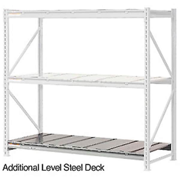 Add another level to your bulk rack for more storage space. Includes one pair of Z-form beams, steel decking and 6 deck supports. Beams are made with 3-1/2inH x 12 gauge Z-formed steel for extra strength. Features three large 1in hooks on each end for positive connection to uprights. Galvanized steel decking offers a long lasting, smooth surface with a rust inhibiting finish. Deck supports provide added strength and support for greater capacity. Easily attaches to beams for tool-free installation. Gray powder coat finish.