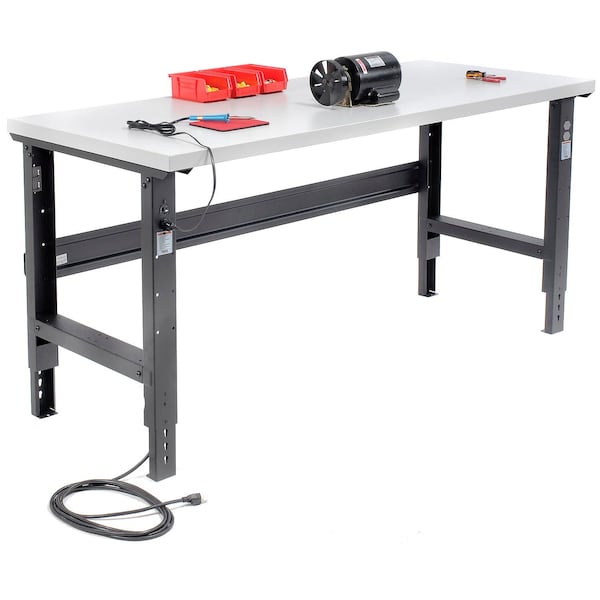 Each high quality, heavy-duty bench is built to give you years of dependable performance. Adjustable height legs feature removable duplex knockouts on front and rear for installation of either a hard wired electrical outlet or an optional plug-in outlet that easily screws into place with no wiring necessary. All steel parts are specially treated to resist rust and finished with black powder coat. Built for rugged use, yet is still easy to keep clean. 1-5/8in thick high pressure plastic laminate-faced particle board core top gives you a smooth, rigid work surface that lasts and lasts. Bench stringer comes with mounting hardware to assemble legs to the bench top. Leg height adjusts in 1-1/2in increments.