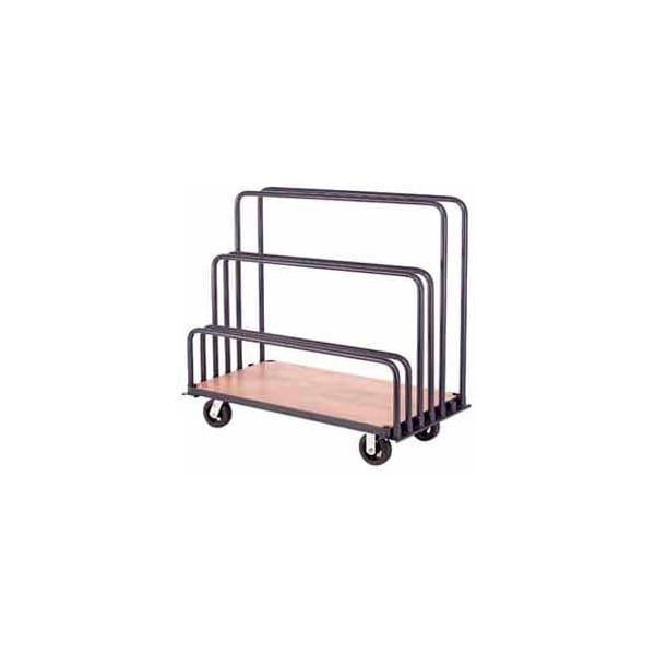 Stores and displays sheet materials such as drywall, plywood and paneling and permits easy viewing and access. Includes 3 pairs of 1-3/16in diameter steel pipe uprights at 12in, 26in and 36in heights mounted over a steel framed wooden deck. Frame construction is 1-1/2inH x 1/2in thick angle iron with rounded safety edges, provisions for floor mounting and a blue enamel finish. This frame includes 7 sockets that permit uprights to be adjusted at 3-1/2in increments. Plywood deck finished with durable lacquer. Includes 2 swivel and 2 rigid casters with 6in x 2in mold-on rubber wheels that have a 2,000 lb. capacity.