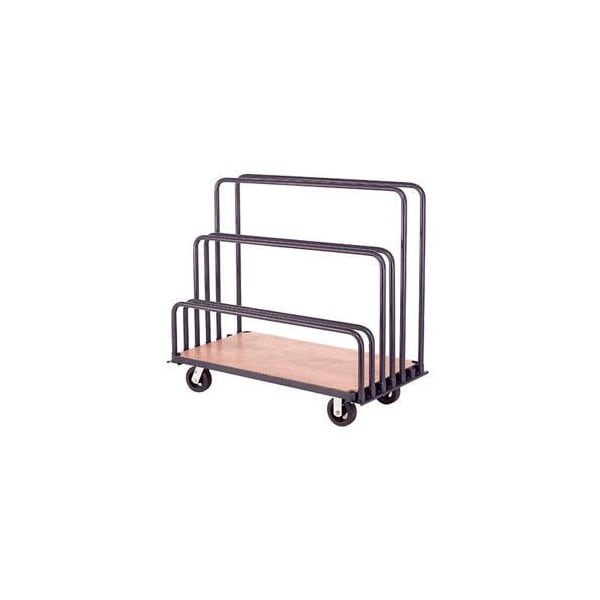 Stores and displays sheet materials such as drywall, plywood and paneling and permits easy viewing and access. Includes 3 pairs of 1-3/16in diameter steel pipe uprights at 12in, 26in and 36in heights mounted over a steel framed wooden deck. Frame construction is 1-1/2inH x 1/2in thick angle iron with rounded safety edges, provisions for floor mounting and a blue enamel finish. This frame includes 9 sockets that permit uprights to be adjusted at 3-1/2in increments. Plywood deck finished with durable lacquer. Includes 2 swivel and 2 rigid casters with 6in x 2in mold-on rubber wheels that have a 2,000 lb. capacity.