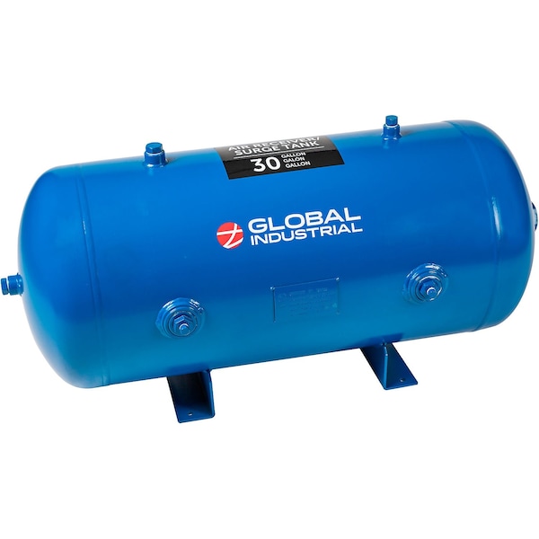 Max 175 PSI. Corrosion-resistant powder coat finish. ASME tested and certified. Keep your pneumatic tools running smoothly with the Global Industrial™ 30-Gallon Air Tank. This horizontal tank has a 175 PSI pressure capacity, making it ideal for providing compressed air for short, peak-demand applications and completing common auto shop tasks such as filling small-to-industrial tires. Plus, its 30-gallon capacity is excellent for additional storage in pre-plumbed pneumatic setups. Multiple NPT port sizes. Plugs included in all openings.