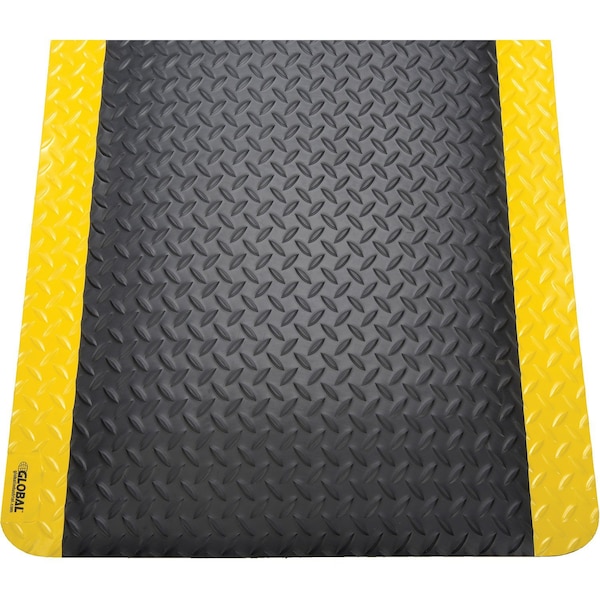 Anti-Fatigue mat made of chemical resistant vinyl, durable diamond tread plate surface bonded to a buoyant foam base. Beveled edges provide safety with Safety Colored Borders for maximum safety awareness. This anti-fatigue, slip resistant, 9/16 thick ergonomic mat provides safety and ergonomic comfort to workers.