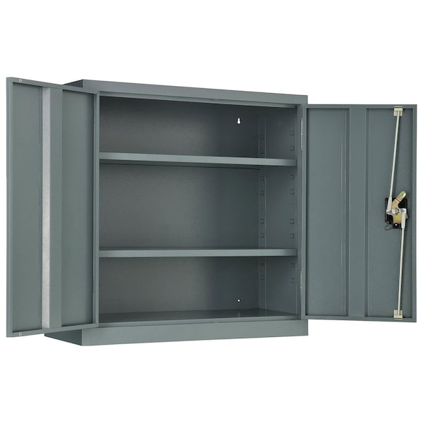 Ideal for storage of tools, aerosol cans, first aids and more. Recessed handles with 2 keyed alike keys for safety and security. Wall Mount Cabinets feature two 22 gauge steel shelves that are height adjustable at 2 increments. Shelf dimensions 30L x 10-7/8D. Durable powder coat finish.