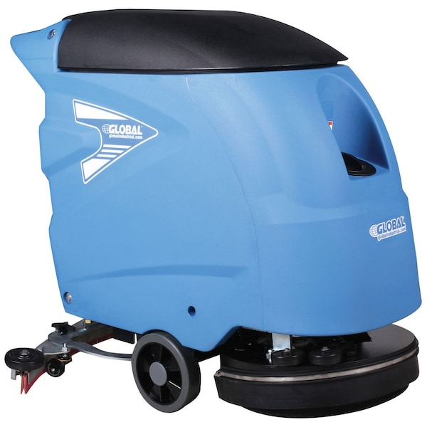 Features a battery energy management system with digital controller for longer run time. Includes two 12V batteries with 3 hr. run time per charge. The exclusive softstart technology helps extend the life of the floor scrubber. Set of squeegee blades and pad driver are included. Scrub brush and floor pads sold separately. Powered by a 3/4HP brush motor that offers 180 RPM. Variable speed control transaxle drive; forward and reverse drive. Features large capacity solution and recovery tanks for low maintenance. Includes heavy duty cast aluminum squeegee assembly. 18 scrubber features 12 gallon solution and 15 gallon recovery tank. Provides 17,000 sq. ft. per hour coverage.