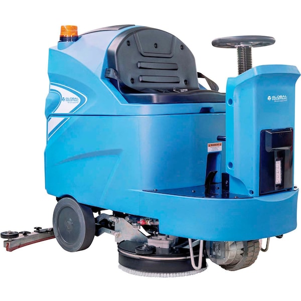 Global Industrial automatic ride-on floor scrubber offers superior performance for heavy duty cleaning and scrubbing applications. Rotationally molded polyethylene housing is corrosion and impact resistant. Powered by a 1.34 peak horsepower brush motor that offers 200 RPM. Variable speed control transaxle drive; forward and reverse drive. Features large capacity solution and recovery tanks for low maintenance. Includes heavy duty cast aluminum squeegee assembly and two 17in decks total of 34in cleaning path. 34in scrubber features 40 gallon solution and 45 gallon recovery tank. Features bright LED headlight and diamond tread platform for added safety. Provides 60,170 sq. ft. per hour coverage. Features a battery energy management system with digital controller for longer run time. Includes three 12V batteries with 4.5 hr. run time per charge. The exclusive softstart technology helps extend the life of the floor scrubber. Maximum weight capacity is 660 lbs. Set of squeegee blades and pad drivers are included. Scrub brush and floor pads sold separately.