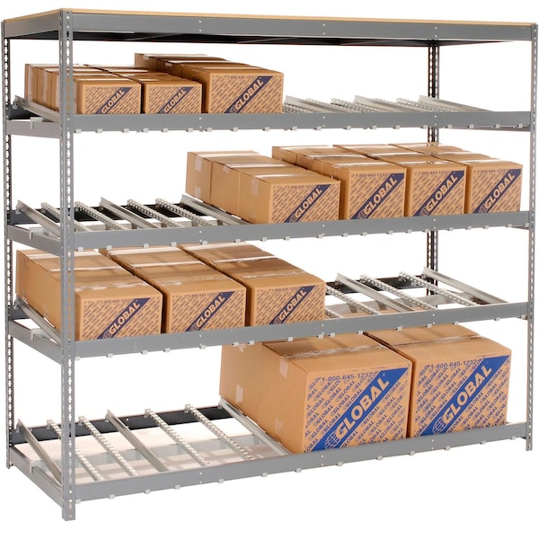 Single Depth Carton Flow Shelving 4 LEVEL 96inW x 36inD x 84inH. Helps make inventory control more efficient. Unique inflowin design uses gravity to slide cartons to front for easy access. Loads from the back to ensure that first inventory in is the first inventory out. Cartons are transported on roller tracks constructed of U-shaped galvanized steel channels with plastic wheels that support 50 lbs./ft. Box guide rails can be adjusted horizontally and beams can be adjusted vertically to accommodate varying carton sizes. Storage shelf levels are adjustable on 1.5in centers for height flexibility. Box guide rails are used between each pair of roller tracks. Additional roller tracks can be added depending upon carton sizes. Each gravity flow storage level includes four pair of roller tracks with five box guide rails and one cross support. Racks include 5/8in thick particle board top storage level that supports up to 1000 lbs. Gray baked enamel finish. Easy assembly.