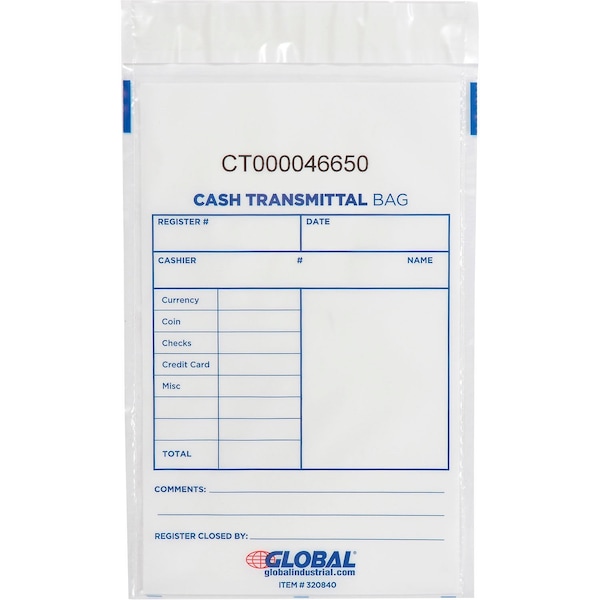 The Global Industrial Cash Transmittal Bag offers a disposable, economical and safe option to transport, track and deposit money. The water and tear resistant 6 x 9 clear bags provide secure content protection and reliable storing conditions. Designed to minimize fraud and loss during cash deposits, transfers and other exchanges, this transparent cash transmittal bag is manufactured with high-strength, 3-layer, co-extruded film and is 100% recyclable Category 4 LDPE. Package quantity is 100 bags.