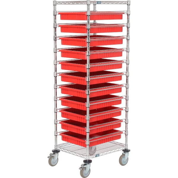 Chrome Wire Cart With 11 3inH Red Grid Containers, 21x24x69