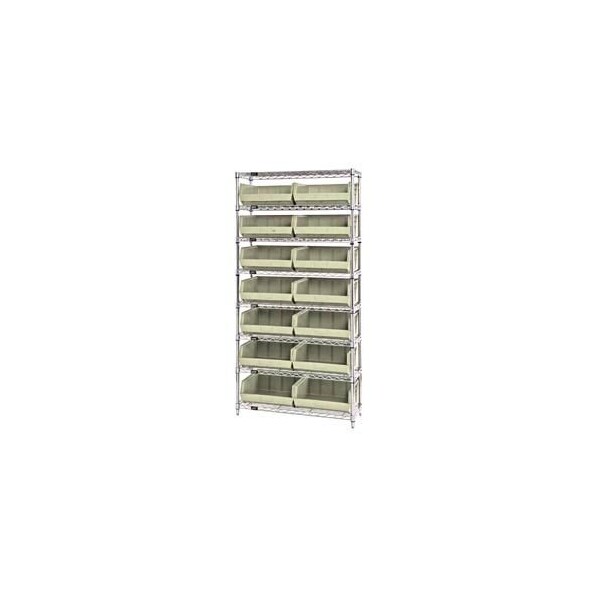 Attractive chrome wire shelving units include giant stacking bins with open hopper fronts for easy access. Chrome wire steel shelving offers an attractive appearance thatfts ideal for retail and display. Heavy duty chrome wire shelving offers 600 lb. shelf capacity. Chrome wire shelves feature truss perimeter for extra strength and reinforcement while allowing light, air and sprinkler penetration. Open wire design helps reduce dust accumulation. Giant stacking bins are made of injection-molded polyethylene with hopper front to allow access and visibility to contents. These super size plastic bins have ribbed reinforced walls to ensure strength and long life. Plastic bin boxes have wide ledges that interlock for positive stacking. Plastic bins resist corrosion, most solvents and rot and withstands -40° to 180°F. Includes molded-in label holders. Shelving measures 36inW x 74inH.