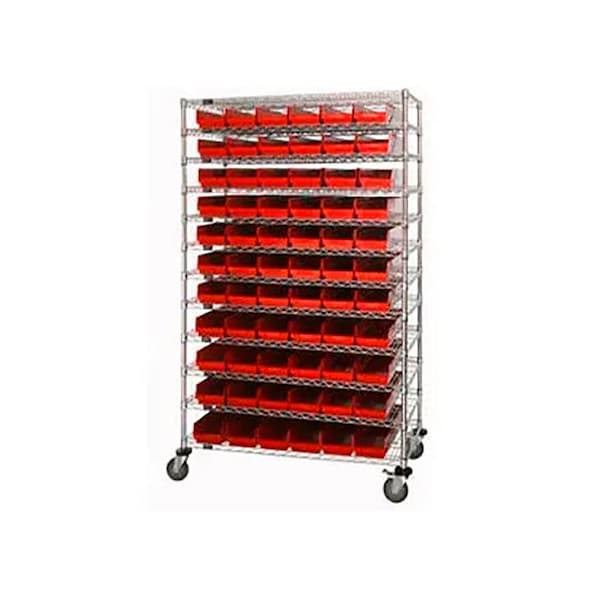 Chrome Wire Shelving with 176 4"H Plastic Shelf Bins Red, 72x14x74