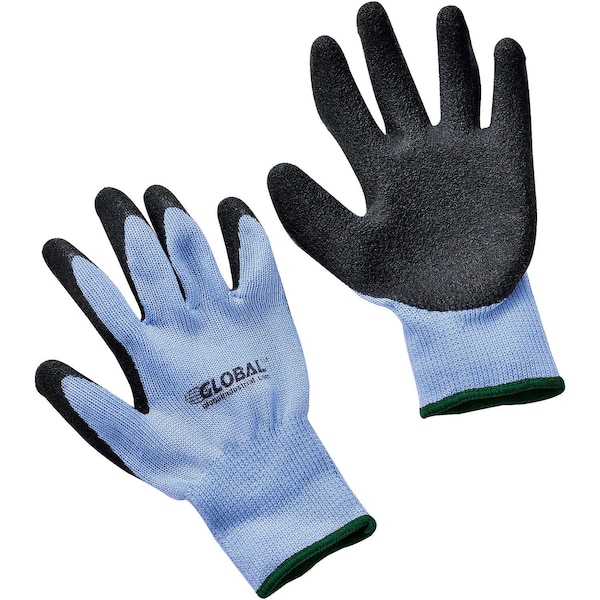 These latex coated gloves provide palm and finger protection for dry working conditions including automotive, material handling, maintenance and repair, and more. The crinkle design improves user handling while reducing hand fatigue for improved work performance and comfort. The latex coating material improves glove elasticity and tear resistance. Includes a polyester lining and crinkle coating. Features a binding cuff style for added support. Color is Black/Blue. Package quantity is 12 pairs. Size is Medium. ANSI/EN approved.