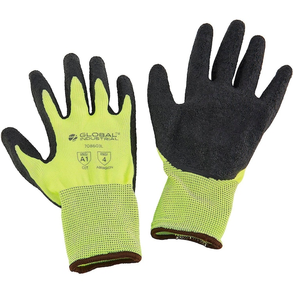Our gloves provide hi-visibility palm and finger protection for dry working conditions including construction, material handling, and maintenance and repair. The crinkle design improves user handling while reducing hand fatigue for improved work performance and comfort. The latex coating material improves glove elasticity and is tear-resistant. The gloves feature a polyester lining to prevent chafing and discomfort, and features a binding cuff style for added support. ANSI/EN approved.