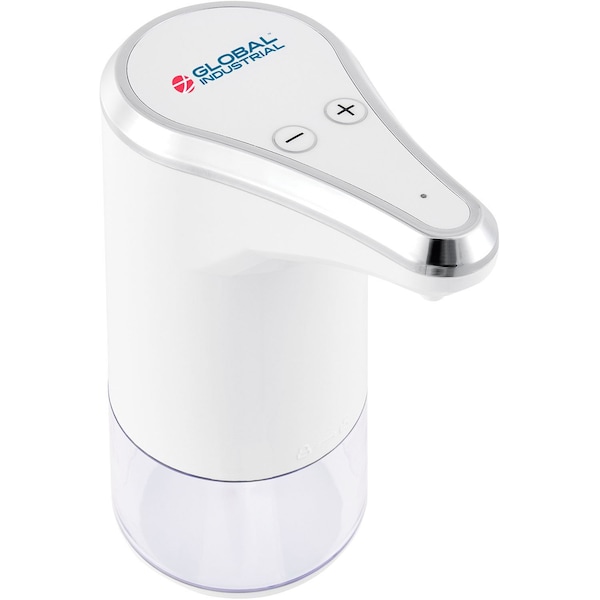 The Global Industrial; Countertop Automatic Foam Sanitizer Dispenser is the perfect dispensing station for any lobby, waiting room or table close to a common entry, gathering or exit point. This automatic dispenser is designed to only accept sanitizing foam solutions up to a 350 mL capacity and dispenses small amounts via contact-free activation. Simply reach hands underneath the spout within the unit's detection range. The sleek plastic frame construction is a neutral white and chrome finish that compliments any workplace or commercial setting from hotel check-in stations to office reception desks. In addition to being lightweight and compact in design to allow for a quick and convenient setup or placement, the unit is battery powered for convenient operation management.