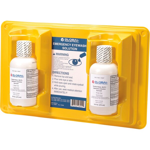 Portable bottle. Comes assembled. 98.3 % ophthalmic solution. All those in favor of workplace safety say fteye.ft The Global IndustrialTM Double Bottle Eyewash Station is a great back up for a quick response to eye accidents in large work environments, where employees might need immediate treatment. The smaller size of these stations is ideal for mounting in workspaces when irritation, burning, and itching occur from dust, smoke, or chemical contamination is possible. The removable bottles are also perfect for portable use when transporting an injured worker to a facility for further medical care. Place them within a 10 second walk from hazards to meet OSHA standards. 1 Year Limited Warranty.