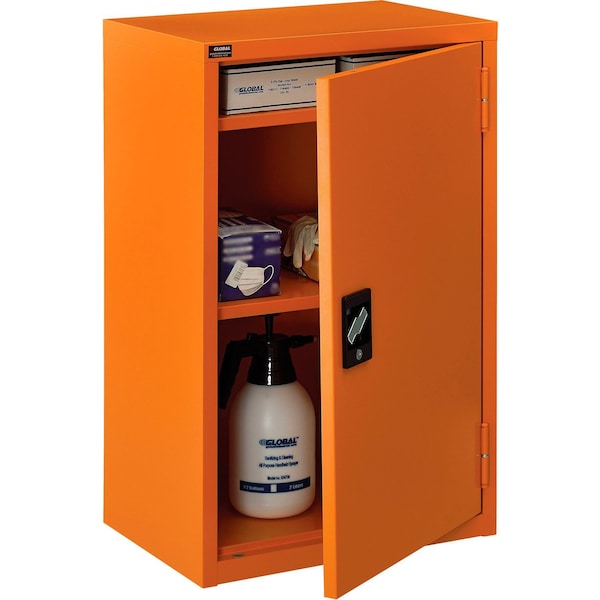 For securable and supreme level storage management at facilities, businesses, and other commercial establishments, the Global Industrial; Emergency Preparedness Counter Height Cabinet is your solution for safely containing medical items, PPE and similar pandemic management supplies. This wall mountable storage occupies minimal space, making it suitable for any hallway, warehouse room or commercial interior. Full body steel construction assures impact resistance to maintain a smooth and industrially resilient quality. Adjustable shelving allows custom organization preferences to fit a variety of different sized items. This cabinet is keyed alike for convenient and secure accessibility. Bright orange color finish provides high visibility.