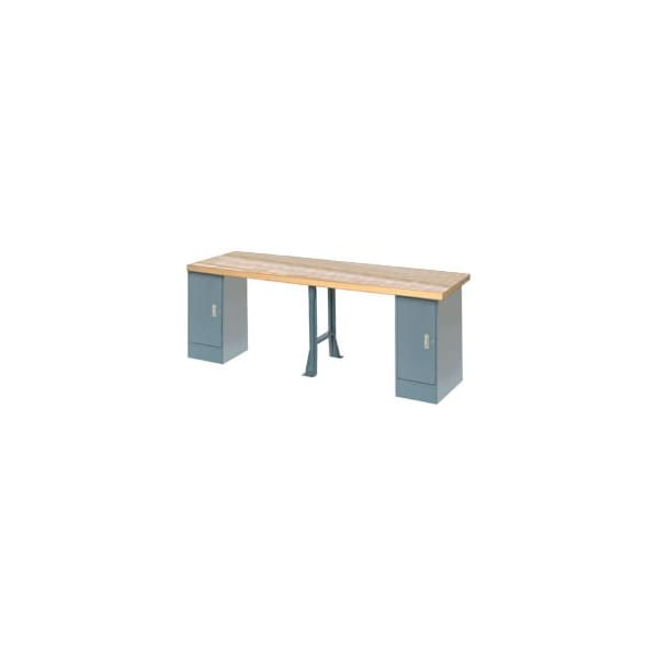 This multi-purpose bench has a 2-1/4in thick square edge top that is warp resistant, durable and long lasting. Stringer braced heavy-duty steel legs guarantee rigidity and stability. Pedestals are 15-3/4inW x 20inD. Maple Butcher Block Top is kiln dried and sealed with a mineral oil protectant. 120inW Benches include two 60inW tops. Overall height is 34-1/4in. Ideal for shipping, assembly and maintenance jobs.