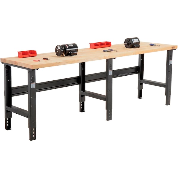 Square-edge maple Boos butcher block by John Boos & Co. High weight capacity to handle most projects and tasks Adjustable-height, C-channel legs. 96inW x 30inD Adjustable Height Workbench C-Channel Leg - Maple Butcher Block Square Edge - Black. A workmanfts dream bench. This solid, rugged top stands up to constant, heavy pounding. Hardwood is kiln dried, electronically glued, sanded to 1-3/4in thickness and has laminated edges. Finished with a penetrating mineral oil for a durable high quality appearance. 96inL benches include 3 leg frames for stability and reinforcement. Adjustable height legs feature removable duplex knockouts on front and rear for installation of either a hard wired electrical outlet or an optional plug-in outlet that easily screws into place with no wiring necessary. Steel parts are finished with scratch resistant black powder coat. Bench stringer comes with mounting hardware to assemble legs to the bench top. Leg height adjusts in 1-1/2in increments.