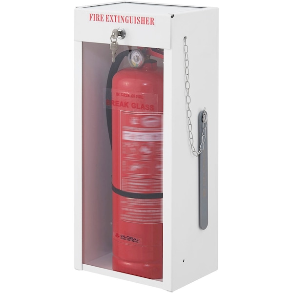 Designed to hold 2-1?2 to 5-pound extinguishers, the white Global Industrial Fire Extinguisher Cabinet is made of durable steel treated with a nondescript white finish that blends in with the wall. It features a breakable glass window to get into the cabinet quickly in emergencies and an easy-to-use pull handle for regular access like maintenance or safety inspections. This cabinet is lockable for safety & security and is designed for indoor use. Fire extinguisher sold separately.
