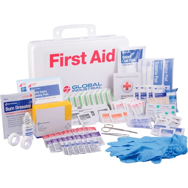 Easily store medical supplies with the Global Industrial First Aid Kit. These first aid kits are encased with plastic cabinet housing for secure, organized storage of all first aid supplies. Can be wall mounted or movable with an easy carry handle. Perfect for any small office setting.