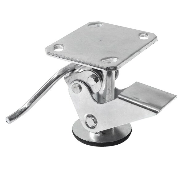 Corrosion resistant zinc-plated steel with 3 rubber footpad. Mount to underside of platform trucks, lift tables and carts to help immobilize while loading or unloading. Simply step down to lock, step again to unlock. 4 x 4-1/2 top plate with slotted holes for 2-5/8 x 3 to 3 x 3-5/8 mounting.