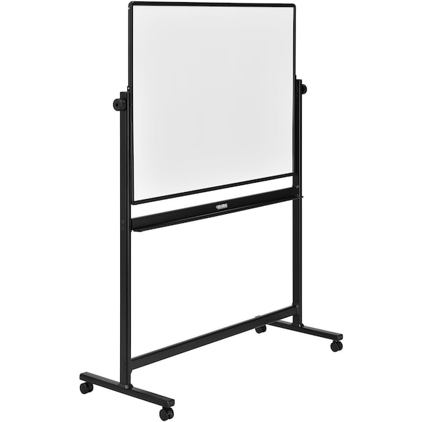 Board size 48W x 36H, Frame size 51-1/2W x 20-1/2D x 63-1/2H. Black powder-coated frame. Rotates 360 degrees on a pivot hinge and locks into the place of your choice, providing twice the functional writing space than traditional wall mounted whiteboards. Board can be locked into place using both tightening knobs on either end. Sturdy casters help you easily transport the board from room to room to allow for continued work or room changes. Painted Steel surface resists staining and ghosting. Four 3 casters 2 locking are included to allow easy, stable mobility.