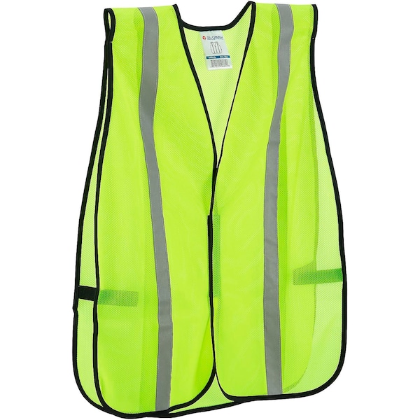 Simple hook and loop enclosure One Size fit with elastic side strips for easy adjustment. Made of lightweight polyester mesh fabric and reflective strips. Use the Global Industria&l#153; Hi-Vis Safety Vest as a construction vest or general lightweight safety attire to help keep workers visible in high traffic areas in and around your facility. Ideal for workers in warehouses and large spaces where material handling trucks move at low speeds. Vest includes 2in silver reflective strips with contrasting trim, elastic side straps for easily adjusting the fit, and a hook and loop front for easy closure. Durable and lightweight.