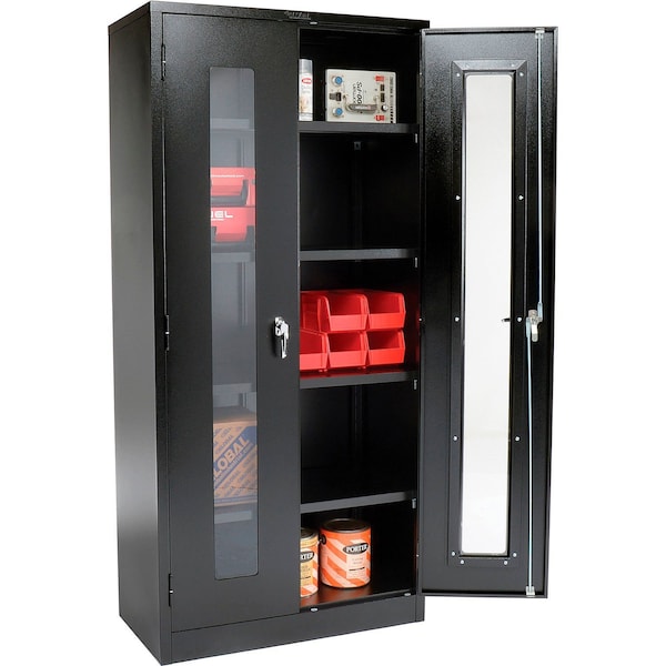 Storage cabinets feature rugged door construction where it matters most Doors have 3 extra large 4 x 3/8 barrel hinges each for security, channel reinforced impact resistant acrylic windows, 3-point locking system with pry-resistant solid steel 5/16 latching rods, and dual chrome plated die-cast key locking handles. Box-formed shelves have full width steel channel reinforcement to help prevent shelf deflection. Holds 300 lbs. per shelf and meets ANSI/ BIFMA shelf capacity standards.