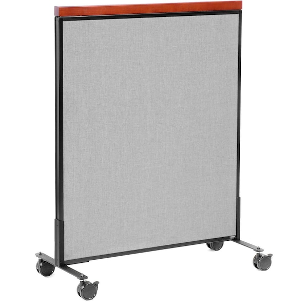 Interion By Global Industrial Mobile Partition Panels allow you to divide a work area in any office or commercial setting. Each double sided unit has tackable fabric and is flame retardant to meet the California 117 flammability standard. 1-3/4" thick upholstered panel features an interior engineered wood (MDF) frame and honeycomb core for structural strength and support. Panel trim is finished with self-extinguishing extruded polymer that offers optimum safety and rigidity. Mobile Panels sit atop steel T-legs on sturdy 3" swivel casters (all locking) that provide full mobility and allow easy transport from area to area. Deluxe models include a cherry finished wood cap which measures 1-1/2"H x 1-3/4"D.