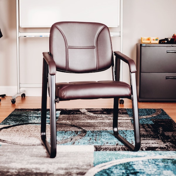 Comfortable, vinyl upholstered guest chairs that feature luxurious 3-1/2 thick foam cushions and padded armrests. The roomy seat measures 20-1/2W x 19, and the back measures 20-1/2W x 16H 19H from seat. 18 gauge all steel stable sled base. Meet BIFMA Standards. Easy assembly.