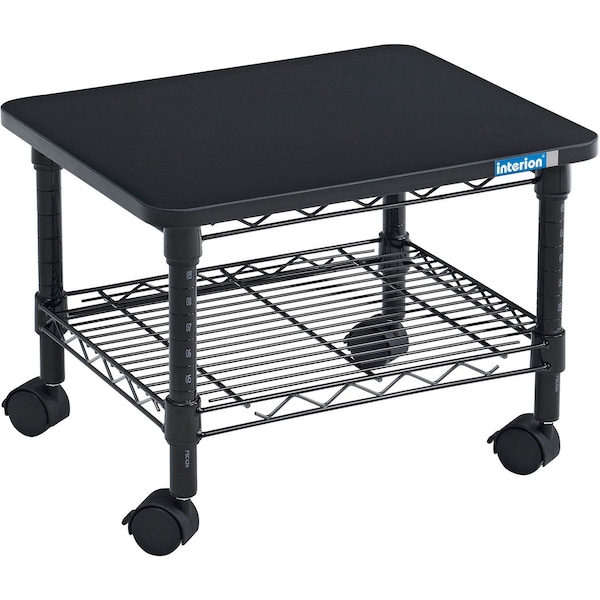 With durable powder coat steel and wire construction, this under-desk machine stand adds versatile storage to your home or office workstation. With a laminate top shelf perfect for printers, fax machines, or personal copiers, a lower steel wire shelf is ideal for storing extra paper or supplies. Mobile on four swivel casters all locking for complete mobility. Attractive black powder coated finish. Easy Assembly.
