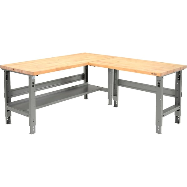 Assembles in a left or right-hand configuration. Table holds up to 1,000 lbs. Bottom shelf is 14in deep and acts as additional storage space. Create more space for DIY projects and tasks with the Global Industrial™ L-Shaped Adjustable Height Workbench. This workbench adjusts from 30in to 37in in height in 1.5in increments, making it easier for users to perform tasks while sitting or standing. Durable steel construction legs ensure years of service and feature removable duplex knockouts on the front and rear for installation of either a hard-wired electrical outlet or an optional plug-in outlet not included. The birch butcher block top is kiln dried, electronically glued, then cured and sanded smooth. This workbench can also be secured to the ground using its floor mounting holes for added stability. Assembly required.