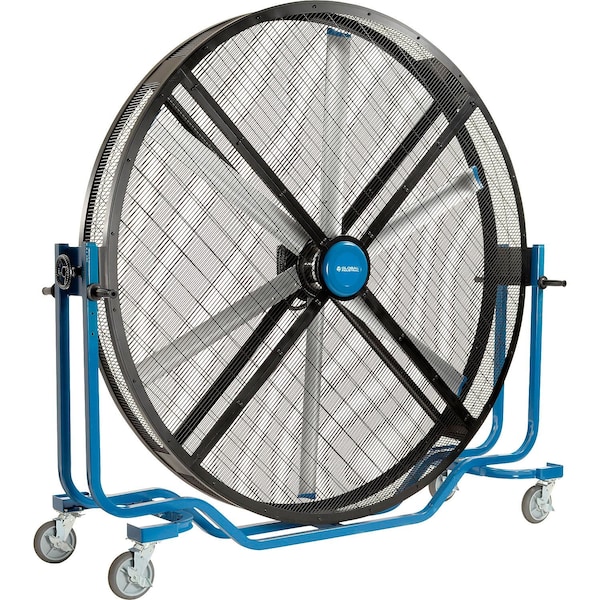 A massive and mobile warehouse fan unlike any other. 65,000 CFM output, covers up to 4,500 Sq. Ft. Adjustable height handles for ease of mobility. We took big mobile industrial fans to a new level when we designed the Global Industrial™ Large 8ft Mobile Industrial Cooling Fan. This massive warehouse fan is built to bring maximum air flow to cool large areas, up to 4,500 Sq. Ft. Perfect for auto shops, warehouses, fitness centers and other indoor spaces. Adjustable position handles allow users to easily grip and steer the Large 8ft Mobile Industrial Cooling Fan. Large locking wheels provide effortless mobility. Heavy-duty steel frame construction. Direct drive EC motor with variable speed control. Handwheel controls for easy tilt adjustments. Fan shipped partially assembled. 120V, 7 Amps. Contoured aluminum fan blades. 25 ft. power cord.