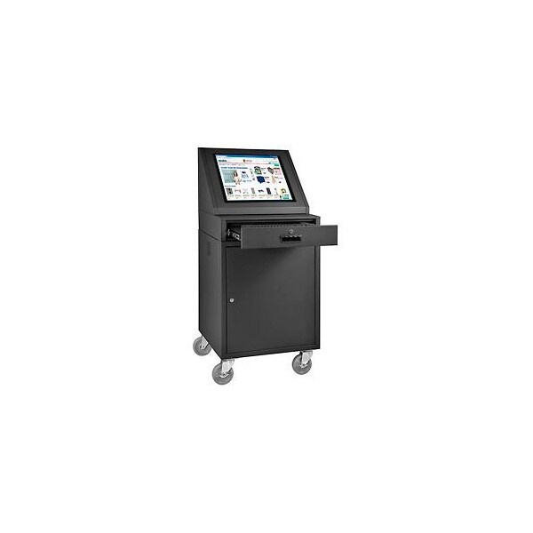 Global IndustrialTM LCD Mobile Console Computer Cabinet, Black. An Exclusive for the Ultimate Viewing Experience. Designed for optimum, ergonomic viewing that helps increase productivity. Convenient sloped display helps reduce neck strain for comfort and glare for clear monitor viewing. Includes 2 types of monitor mounts to hold LCD monitors up to 21in diagonal. Includes a VESA mount monitor bracket and adjustable channel formed arms that support the monitor frame. The locking monitor compartment includes a break-resistant 18-1/2inW x 16-1/2inH acrylic window framed in heavy-duty steel. Window panel is removable which gives easy access to Touch Screen Monitors. Includes a 6-1/2in ledge for additional work surface. Locking keyboard drawer and height adjustable printer shelf extends fully on steel ball bearing suspensions. Lower compartment has front and rear doors. Cable management openings throughout. All locks are keyed alike for dependable security that limits access to components and prevents theft and vandalism. Rear panels are louvered to regulate heat. Moves on 5in diameter swivel casters 2 locking. Black Powder coat finish. Optional Fan with 5ftL power cord reduces heat build up. Order one fan for each upper, lower and side car cabinet. Upper frame consists of: 24 gauge panels, 19 gauge sliding keyboard/mouse tray. Lower frame consists of: 23 gauge door & door frame, 23 gauge side & bottom panels, 20 gauge drawer thickness. Optional Accessories side shelves, CPU side car cabinet, fan and sliding mouse tray sold separately. Easy Assembly. Dimensions: Upper compartment 24-1/2inW x 22-1/2inD x 22-1/8inH. Lower interior compartment 20-3/4inW x 21inD x 23-1/4inH. Locking slide-out keyboard drawer 19-1/2inW x 17-3/4inD x 2-1/4inH. Acrylic Window 18 1/2inW x 16 1/2inH. Overall unit 24-1/2inW x 22-1/2inD x 55-1/2inH.