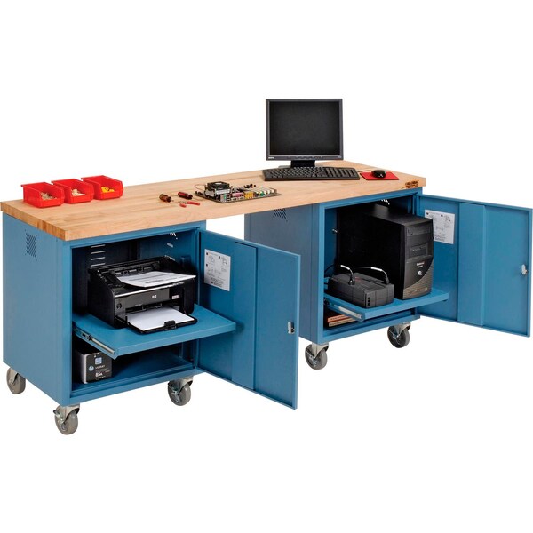 Maple Square Edge Mobile Pedestal Workbench Blue 72 x 24. Mobile Pedestal Computer Workbench provides ease of transport for your workbench where you need it. Can be used as a repair station as well as a computer work center. Built with two steel pedestal cabinets that limit theft and access to valuables, computer peripherals, and keyboards. Upper worksurface is available in safety edge and square edge with various sizes. Pedestsal compartments interior measurement is 20-3/4in W x 21inD x 23-1/4in H. Optional fan with 5in power cord reduces heat build up. One fan can be installed in each compartment. Rollout shelf is height adjustable in 2-1/4in increments and fully extends on steel ball bearing suspensions. Upper worksurface is 72x24, Maple Square Edge, Blue.