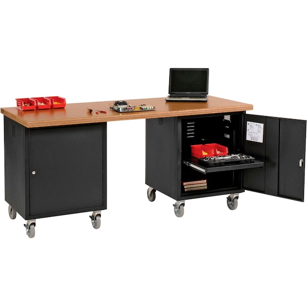 The Global Industrial™ Mobile Pedestal Workbench provides ease of transport for your workbench where you need it. Can be used as a repair station as well as a computer work center. Built with two steel pedestal cabinets that limit theft and access to valuables, computer peripherals, and keyboards. Upper worksurface is available in safety edge and square edge with various sizes. Pedestal compartments interior measurement is 20-3/4in W x 21inD x 23-1/4in H. Optional fan with 5in power cord reduces heat buildup. One fan can be installed in each compartment. Rollout shelf is height adjustable in 2-1/4in increments and fully extends on steel ball bearing suspensions. Upper worksurface is 72 x 30in, Shop Top Safety Edge, Black.