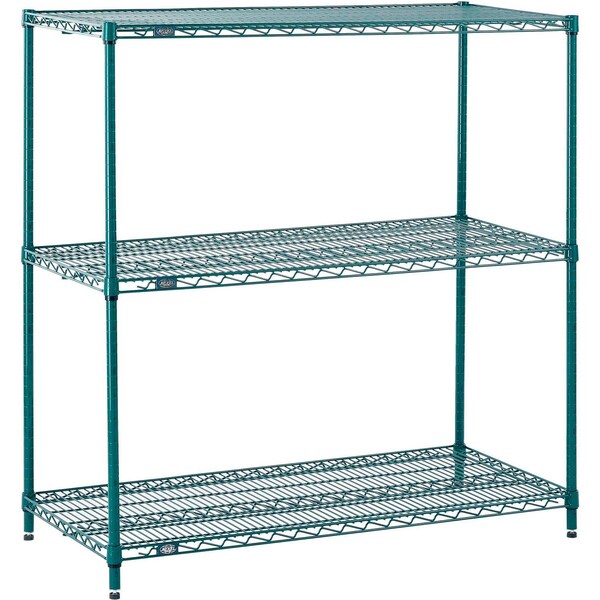 Designed with a powder coated green epoxy finish that handles temperature and moisture extremes well. Starter Unit includes 4 posts with leveling feet, 3 wire shelves and plastic snap on sleeves to secure shelves to posts. Reinforced shelves with welded surface ribs for added strength. Open design to maximize air and light circulation and minimize dust accumulation. Includes 4 posts with leveling feet, 3 shelves and snap on sleeves. Shelves easily adjust without tools at 1 increments. NSF approved for wet or dry use.