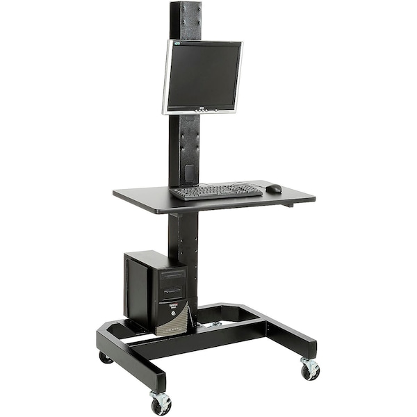 78inH Mobile Unit with VESA Mount. This complete workstation includes a center post, work surface, flat panel screen mount and CPU holder. All steel surfaces include a rugged, attractive powder coat finish. Easy assembly. The super strong 5in x 5in steel center post moves easily on a stable caster base that measures 38inW x 34inD x 10inH. Base includes four 4in rubber casters, 2 locking. To hide all cables, the post includes cable management openings. The rectangular work surface is a 1in thick wooden core finished in rugged plastic laminate that measures 36inW x 20inD. This 78inH unit can accommodate sitting or standing users with 2 different work surface heights. The VESA mount accommodates any flat panel monitor from 10-30in. Mount permits monitor to tilt up 15° and down 5° easily and without tools to provide optimal viewing. Locks in place with a thumb screw. The CPU/power supply holder adjusts to hold items up to 9inW securely and includes non-skid cushions to prevent marring. Devices depicted in the images are not included.