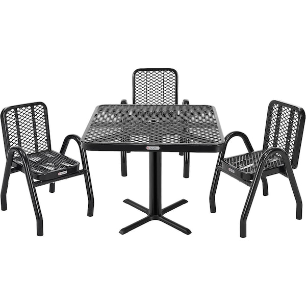 Thermoplastic coating resists fading, mold, and vandalism. Set includes 4 comfortable dining chairs. High-gloss surface stays cool to the touch. Long-lasting and durable steel construction. Provide unique style and comfortable outdoor dining for guests with the Global Industrial™ Outdoor Dining Set. Ideal for restaurants, bars, outdoor food courts, public parks & streateries! Thermoplastic coating resists fading, mold and vandalism. High-gloss surface is designed to stay cool under the hot sun. 36in square table top includes an opening to accept an umbrella with a pole of up to 1-1/2in diameter. The sturdy pedestal base features a black textured powder coat finish that resists corrosion. This table & chair set is easy to clean and will ensure maintenance-free durability through years of high-traffic usage. Easy assembly.