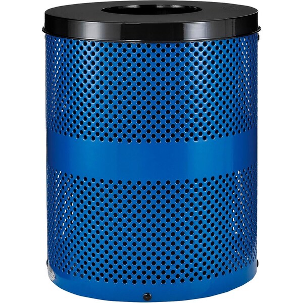 Outdoor Perforated Steel Trash Can With Flat Lid, 36 Gallon, Blue