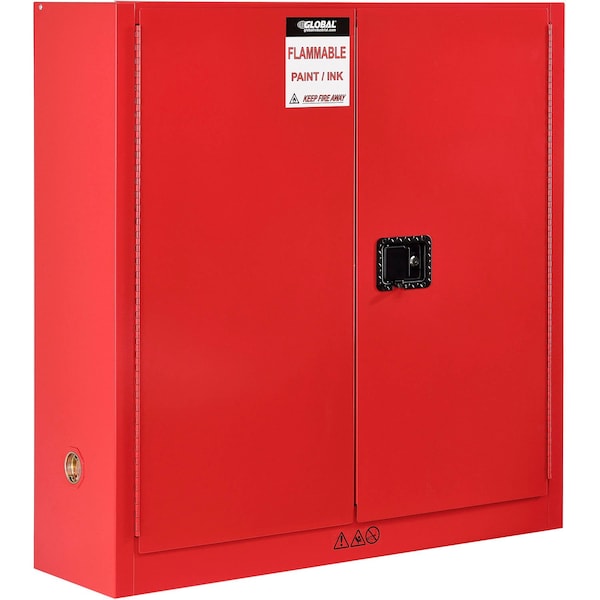 GlobalTM Paint & Ink Storage Cabinet - 24 Gallon - Manual Close 43inW x 12inD x 44inH. Steel Cabinets are constructed of all welded, double walled 18 gauge steel with 1-1/2in air space and dual 2in diameter capped vents with flame arrestors. Doors are double walled with 14 gauge outside and 18 gauge inside. All models piano hinges and 3-point locking doors for added security. Features flush mounted, grip padded handle. Galvanized steel shelves have 350 lb. capacity and adjust on 2-1/2in centers. Ground connection dissipates static charge. Includes 2in leak proof doorsills and adjustable leveling feet. Paint & Ink cabinets have a red powder coat finish and meets NFPA code 30 and OSHA standards. FM approved. Some state and municipalities may require self-closing doors on flammable safety cabinets. This cabinet has manual closing doors, please review your local ordinances prior to purchasing.