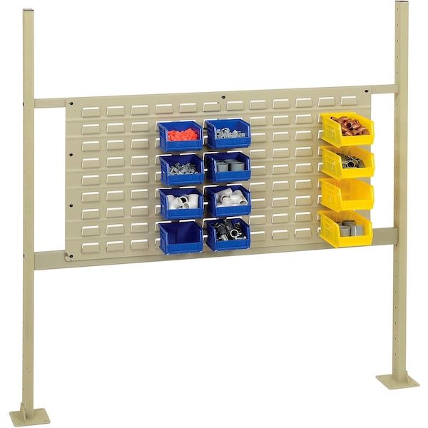 Louver Panel Kit for 48in Workbench - Tan. Workbench louver and pegboard panels add storage space and versatility to workbenches. Steel louvered panel easily attaches to Uprights using the Panel Mounting Rails to provide additional storage on workbenches. Panel kits are made using durable steel with a powder coat finish for lasting durability. Louver panel allows easy attachment of plastic hanging bins bins sold separately for convenient storage of small parts and supplies. Fits 48in workbenches. Kit Includes: 1 36 x 19 Louver Panel - Tan. 1 48in Panel Mounting Rails - Tan. 1 pair 48inH Uprights - Tan.