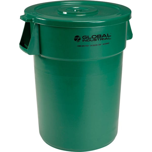 Made of seamless leak-proof polyethylene plastic resin. Durable construction ensures it wonftt chip, crack, peel, or corrode. Empty can is designed to nest for added storage. Dispose and remove your waste easily with the Global Industrial Plastic Trash Can with Lid. Equipped with molded-in handles for a sturdy grip and added comfortespecially when the can is full, this receptible is ideal for all janitorial and maintenance needs. Its durable plastic construction is easy to clean and wonftt corrode, while the rolled formed top rim is reinforced for added strength and longevity. Cans of a similar size will nest when empty to save facilities valuable storage space and the lid offers protection from spills, foul odors, and keeps pests, such as rats and racoons, at bay. NSF approved. 1 Year Limited Warranty.