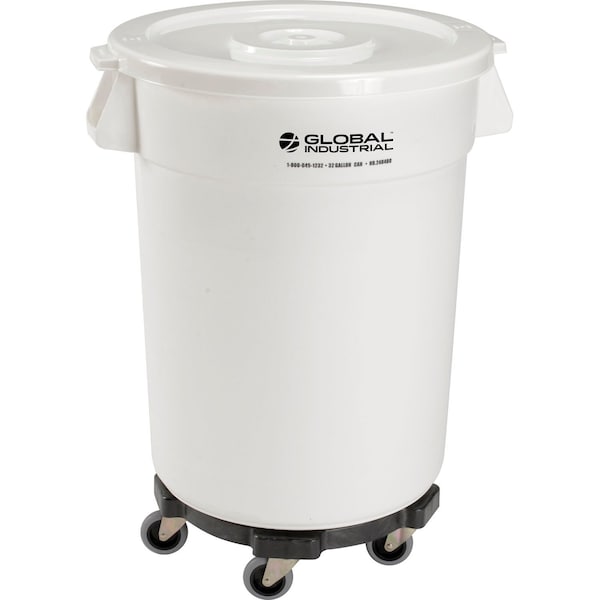 Plastic Trash Can with Lid & Dolly, 32 Gallon White