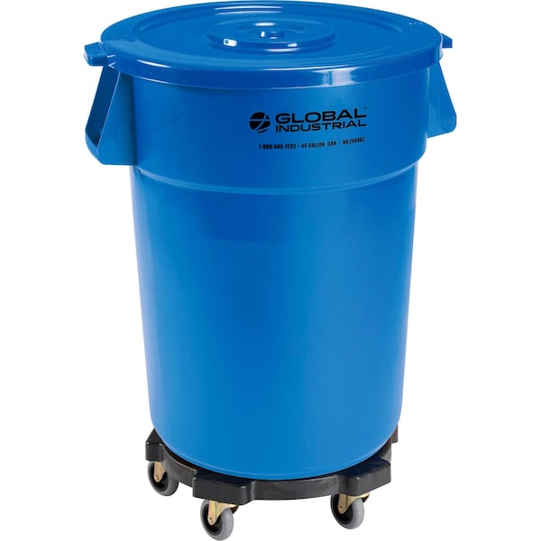 Global Industrial™ Plastic Garbage Can with Lid & Dolly - 44 Gallon Blue. These trash cans are made with durable, long lasting polyethylene resin. Leak-proof seamless plastic allows easy cleaning and waste disposal, and wonftt corrode, chip, crack or peel. These garbage cans nest when empty to save valuable storage space. Rugged rolled formed top rim is reinforced for added strength and durability. Strong grip handles make lifting easy. Flat lid helps protect contents and keeps odors in. The included dolly converts the receptacle into an easy-to-move portable container. Includes five 3in non-marring swivel casters. Garbage can and lid are NSF approved. 1 Year Limited Warranty. Includes: 1 44 Gallon Trash Can, 1 44 Gallon Flat Lid, and 1 Dolly.