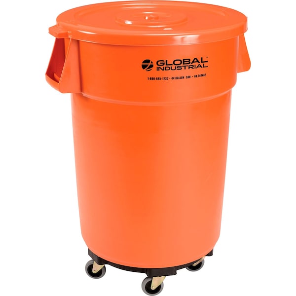 Plastic Trash Can with Lid & Dolly, 44 Gallon Bright Orange