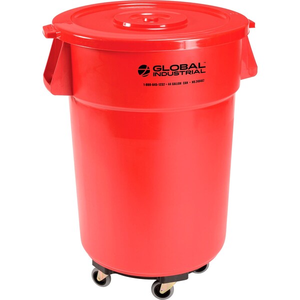 Plastic Trash Can with Lid & Dolly, 44 Gallon Red