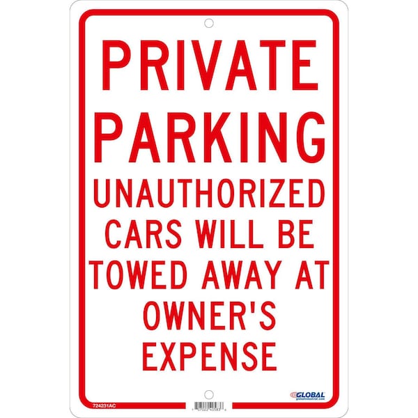Private Parking Unauthorized Cars Will Be Towed., 18x12, .080 Aluminum
